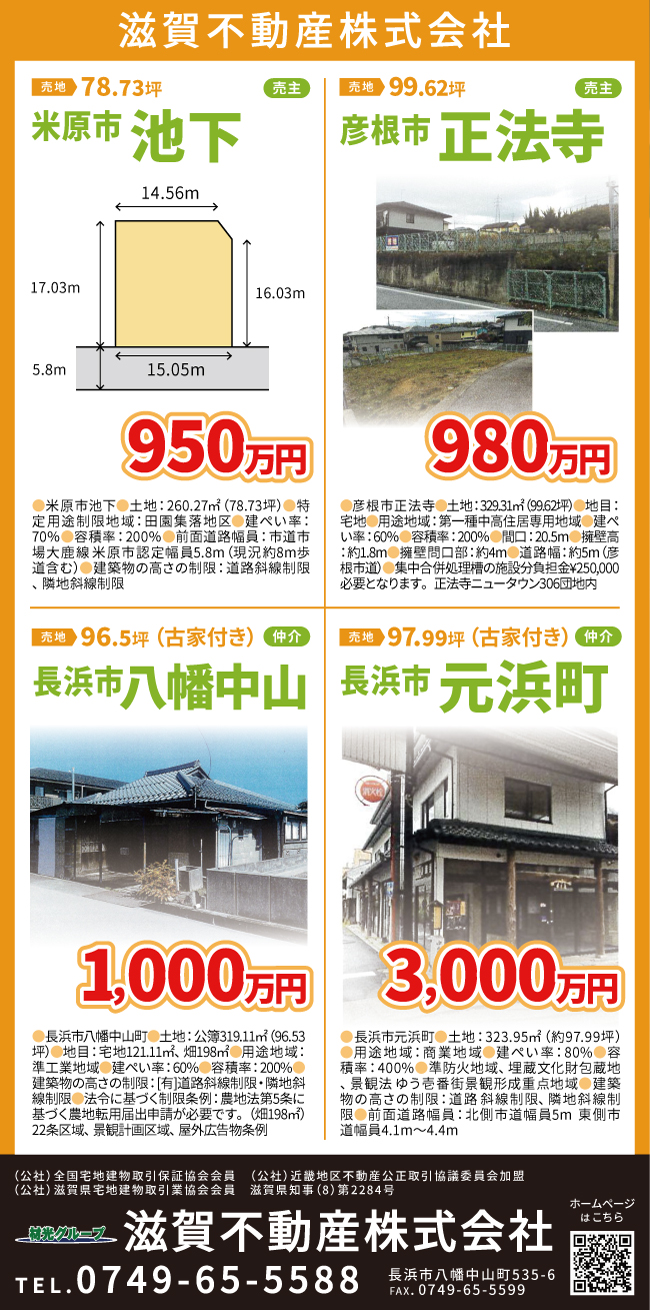 ●米原市池下●土地:260.27㎡(78.73坪)●特定用途制限地域:田園集落地区●建ぺい率:70%●容積率:200%●前面道路幅員:市道市場大鹿線 米原市認定幅員5.8m(現況約8m歩道含む)●建築物の高さの制限:道路斜線制限、隣地斜線制限⚫︎売主